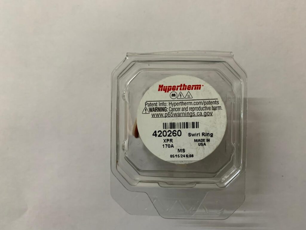 • The Hypertherm 420260 Swirl Ring plays a key role in directing plasma gas for precise cutting. Compatible with XPR systems, it enhances arc stability and cut consistency. Made from high-quality materials, this swirl ring helps reduce wear on other consumables, supporting smooth, efficient, and accurate cutting operations every time.